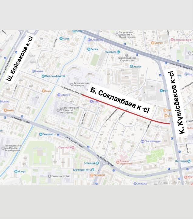 — будет продолжено строительство улицы Б. Сокпакбаева на участке от ул. Ш. Бейсековой до ул. К. Кумисбекова. Движение на данном участке будет полностью перекрыто в период с 5 апреля по ноябрь текущего года.