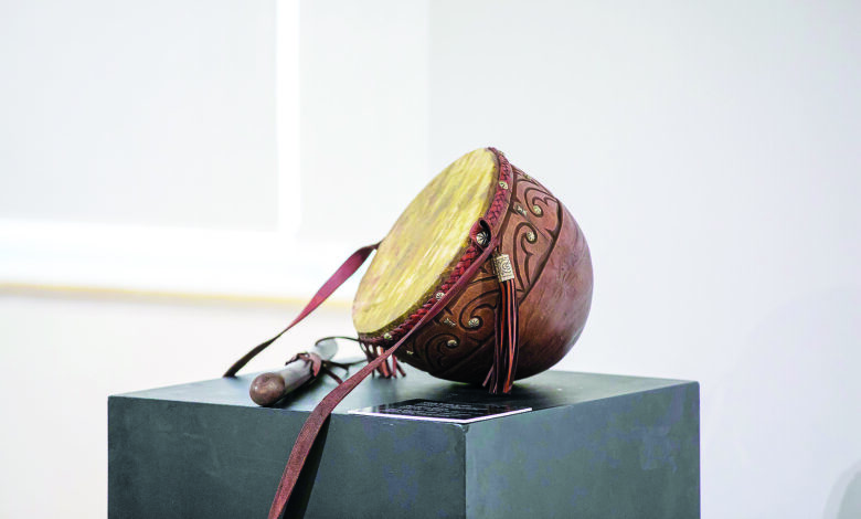 — Во многих экспонатах можно заметить характерную особенность работ Ергазы Исатаева — сочетание дерева и черного металла. Мастер одинаково уверенно работает с различными материалами, включая дерево, кожу и металл. Одной из авторских работ является композиция «Ғасырлар үні» («Голос веков»). В ней соединены образы домбры и кобыза — традиционных музыкальных инструментов казахского народа. Работа символизирует движение звука и отражает богатство музыкального наследия степи, — поясняет гид.