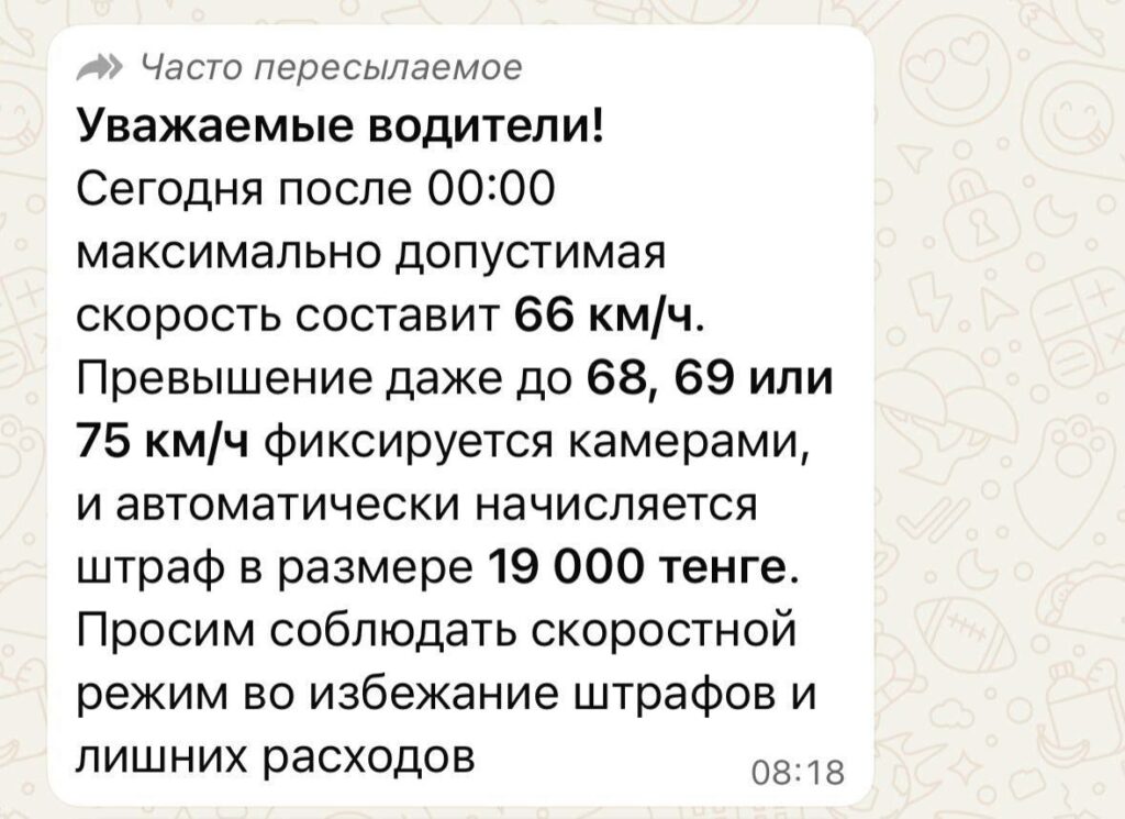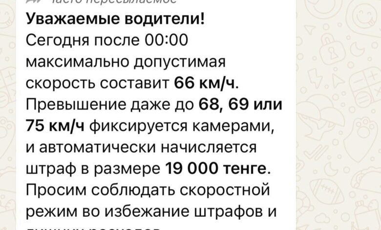 В мессенджере WhatsApp распространилось сообщение о введении новых ограничений скорости на дорогах столицы в связи с погодными условиями. В Департаменте полиции прокомментировали данную рассылку, передает Вечерняя Астана.