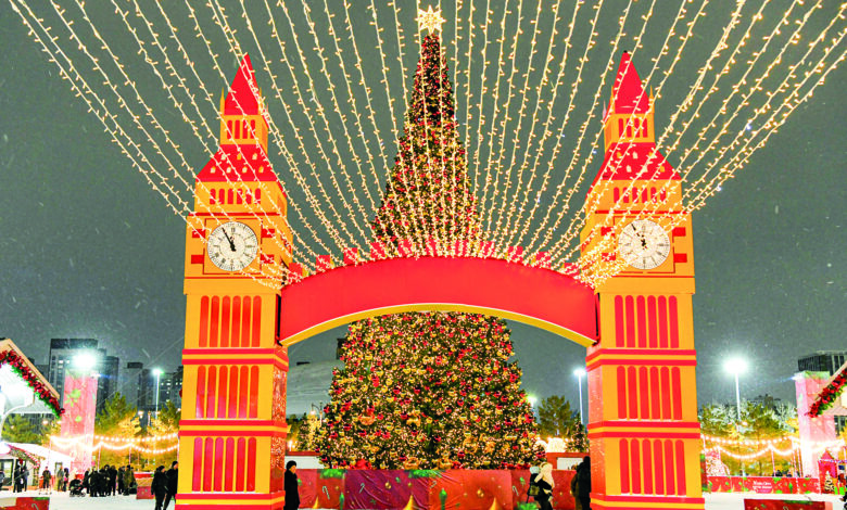 Монументальная (25 метров) и строгая, она выглядит как символ города в праздничный период. Плотный декор, чаще всего в золотой гамме, подчеркнутая форма и крупное открытое пространство вокруг создают ощущение торжественного входа в Новый год. Она не про уют, а про размах — и именно этим впечатляет.
