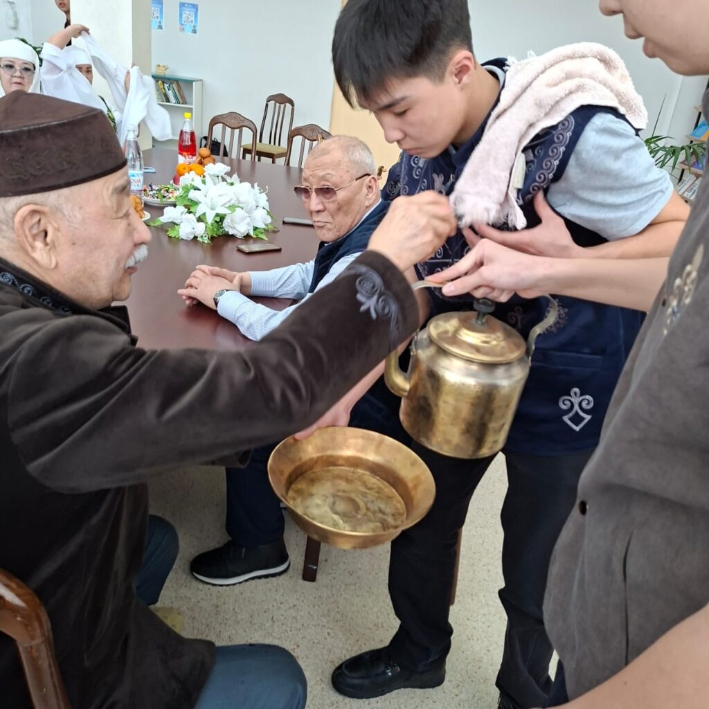 Не менее интересно сыграли свою роль в постановке юноши, которые показали традиции «Қонақ күту»: подходя к каждому приглашенному они поливали руки водой, получая от них бата.