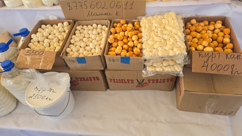 Предприниматель из Мангыстау рассказал о личном крестьянском молочном хозяйстве. Они привезли домашний творог за 1000 тенге , курт за 1 кг- 3500 тенге , домашнее масло — 4000 тенге, кумыс — 1500 тенге, тары за 1 кг- 1000 тенге.