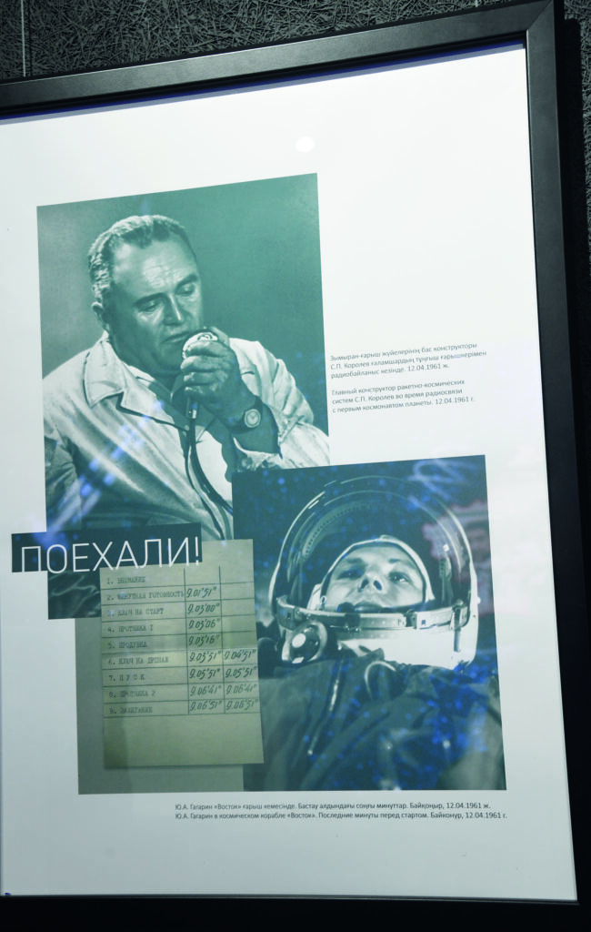 Выставка объединила около 30 уникальных музейных предметов и более 60 архивных документов, представленных в двух тематических разделах — «Первый шаг в бескрайний космос» — ретроспектива подвига Юрия Гагарина, открывшего человечеству путь к звездам и ставшего мировым символом прогресса и «Казахстан и космос — летопись достижений республики». Особое внимание уделено триаде казахстанских покорителей орбиты — Токтару Аубакирову, Талгату Мусабаеву и Айдыну Аимбетову.