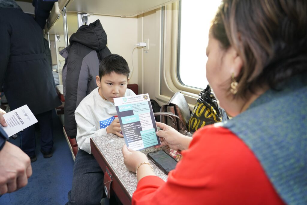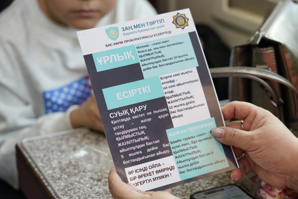 По словам сотрудников прокуратуры, за время проведения информационно-разъяснительной работы ими посещены четыре пассажирских поезда: Жезказган — Астана, Караганда — Астана, Костанай — Алматы, Алматы — Астана, где с пассажирами проведена разъяснительная работа, на 56 станциях республиканского значения гражданам розданы информационные и предупредительные листовки.