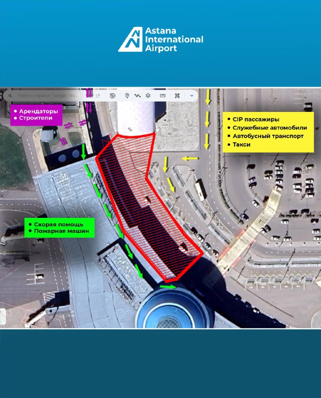 Международный аэропорт Астаны рекомендует пассажирам заранее планировать маршрут прибытия в терминал Т2 и учитывать обновлённую схему движения.