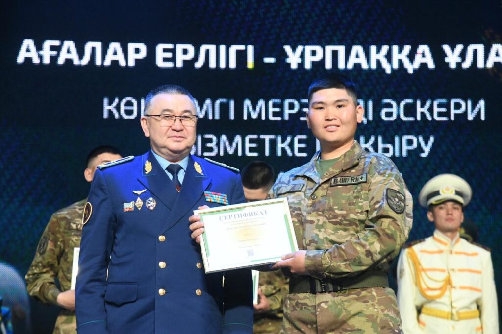 После чего замминистра оборонного ведомства торжественно вручил группе увольняемых в запас военнослужащих – отличников воинской службы сертификаты на получение льготного образования в казахстанских вузах.