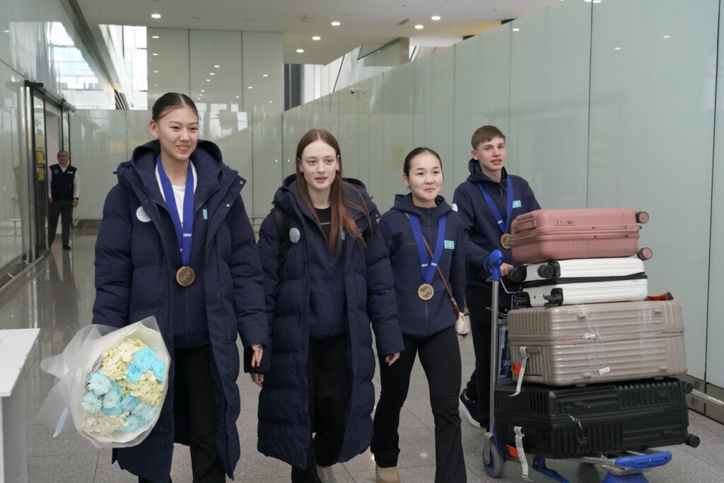 В международном аэропорту столицы состоялась торжественная церемония встречи астанчан — призеров чемпионата мира по шорт-треку среди юниоров, прошедшего в США.
