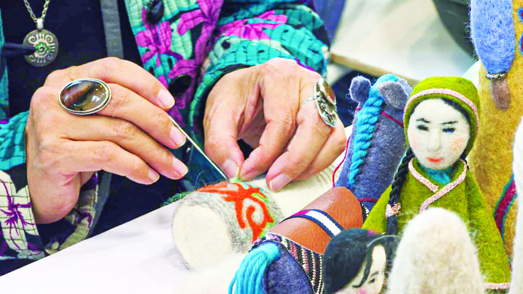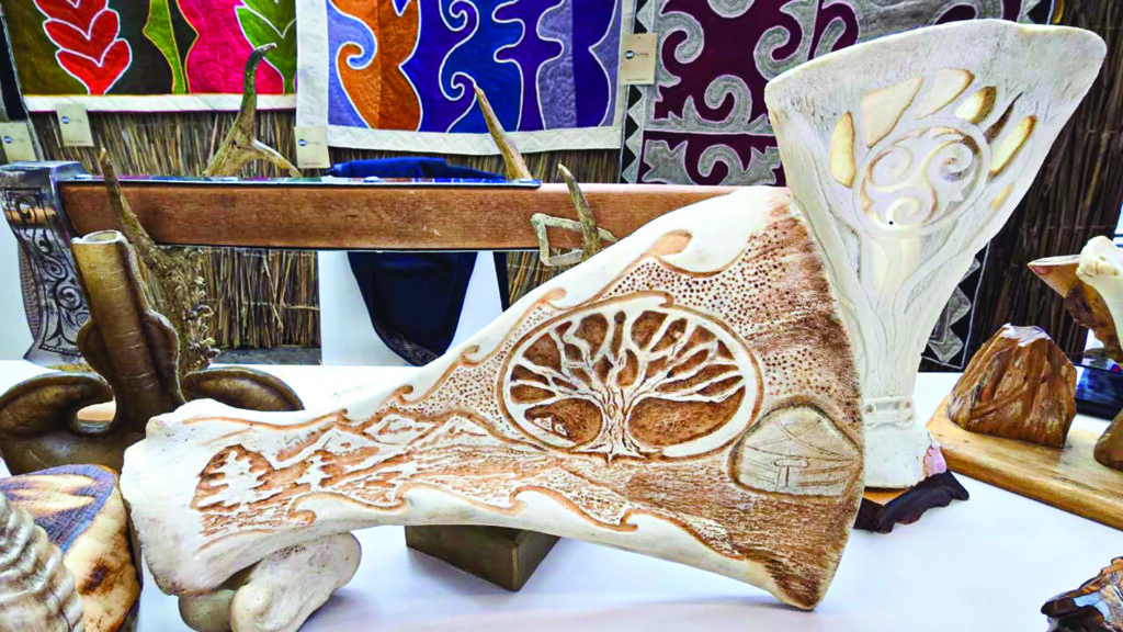 Ремесленник Нуржан ЕСХОЖИН из Восточно-Казахстанской области по професии преподаватель художественного труда, занимается резьбой по дереву, кожевенным и косторезным искусством, создает камчи, торсыки, музыкальные инструменты и обереги — тумары.